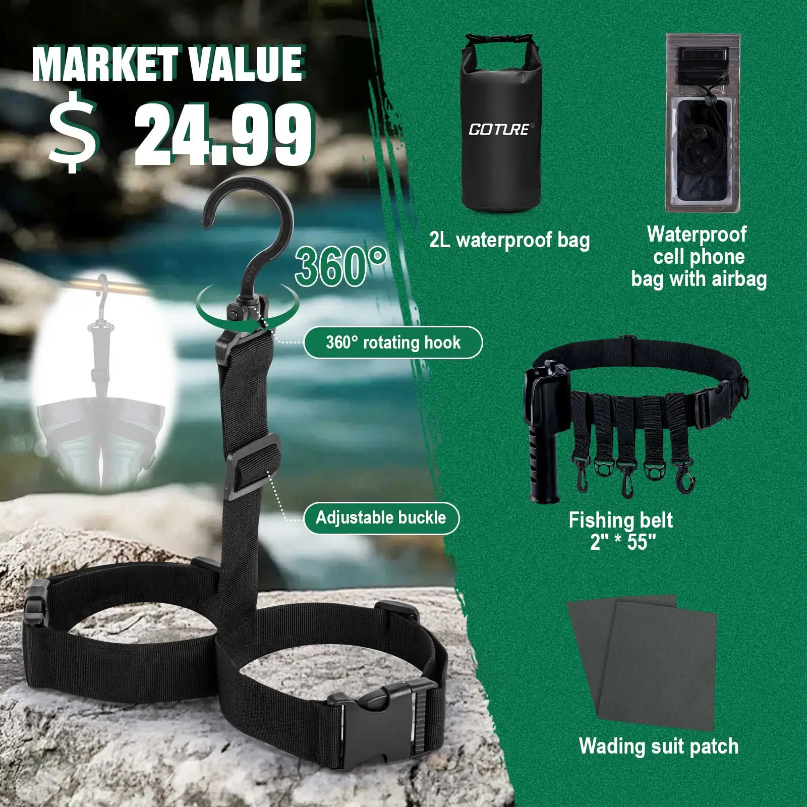 Goture fishing wading belt features 6 removable hanging buckles, 1 D-ring, and a fishing pole holder (max rod handle diameter: 1.37in) to keep your tools organized and hands free. It also includes a flip-out chest pocket, internal pocket, IPX8 waterproof phone case, and a 2L dry bag to keep your essentials dry during water activities.
