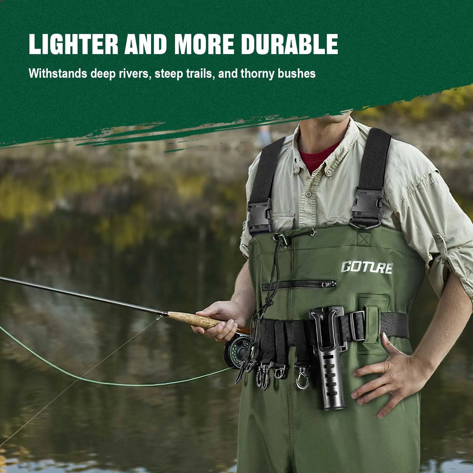 Goture hip waders for men are best options for outdoor explorers. Ultra-lightweight design with breathable & soft nylon fabric keeps you dry in hot summer, gives maximum comfort and greater mobility in activities. It's also roomy enough to layer under in cold weather, allowing you to have the fun without cold or wet.